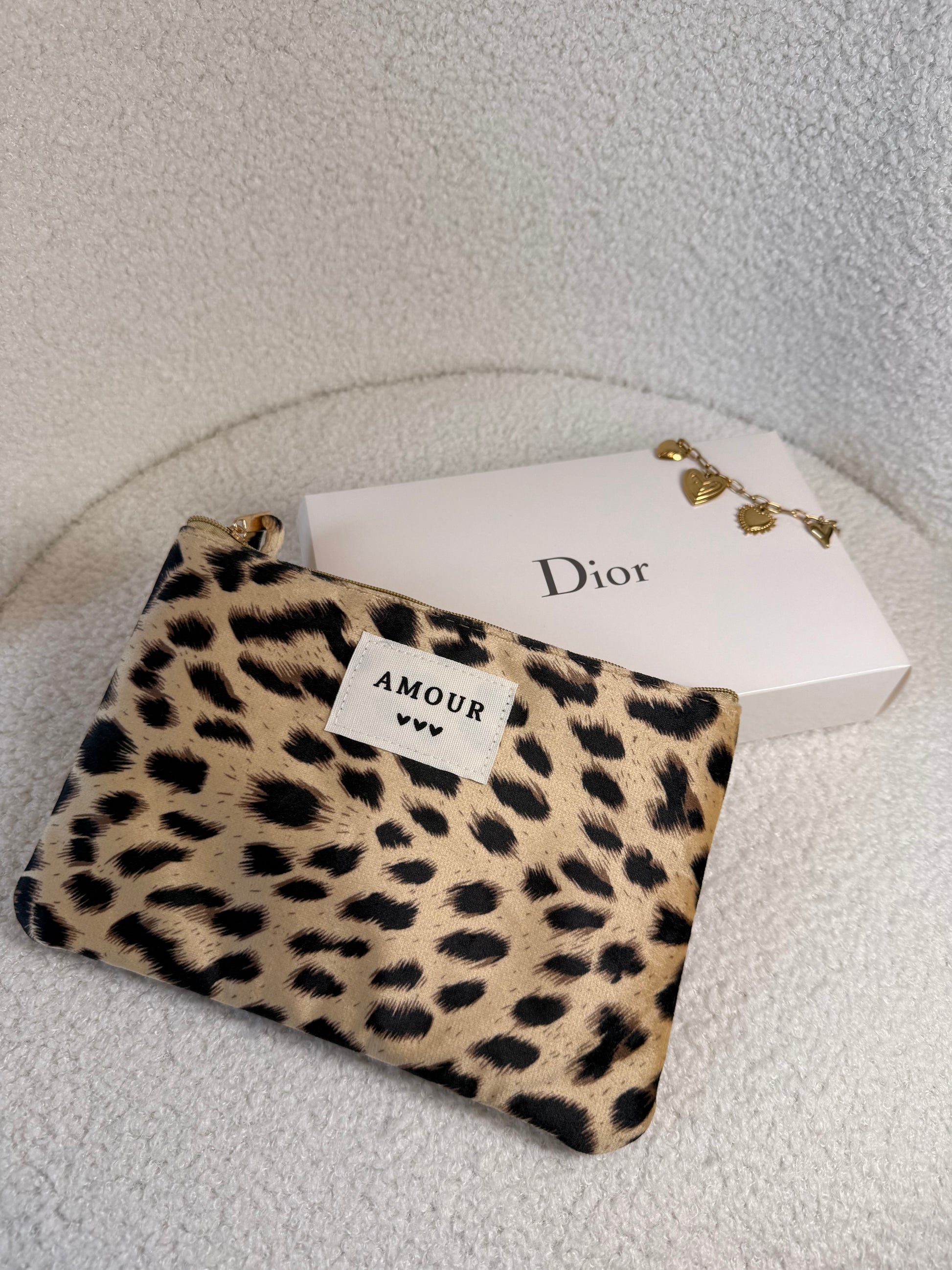 ♡ Description : Trousse effet à motifs léopard imprimés. Avec écriture brodée en fil doré et fermeture éclair en laiton doré.